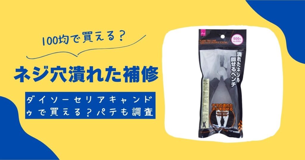 ネジ穴潰れた補修をお探しなら、100均で買えます! 調べたところ、以下の100均で取り扱っていることがわかりました。 ダイソー キャンドゥ ワッツ しかしネジ穴が潰れた時の補修グッズは、使いやすさや安全性も求められるものですよね。 100均のクオリティ... 生活雑貨編み物道具は100均セリアキャンドゥで売ってる?初心者向きはダイソー!