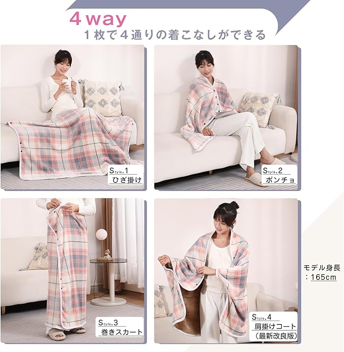 - ひざ掛け、ポンチョ風、巻きスカート風、ボレロ風、1枚で4通りの着こなしができる。