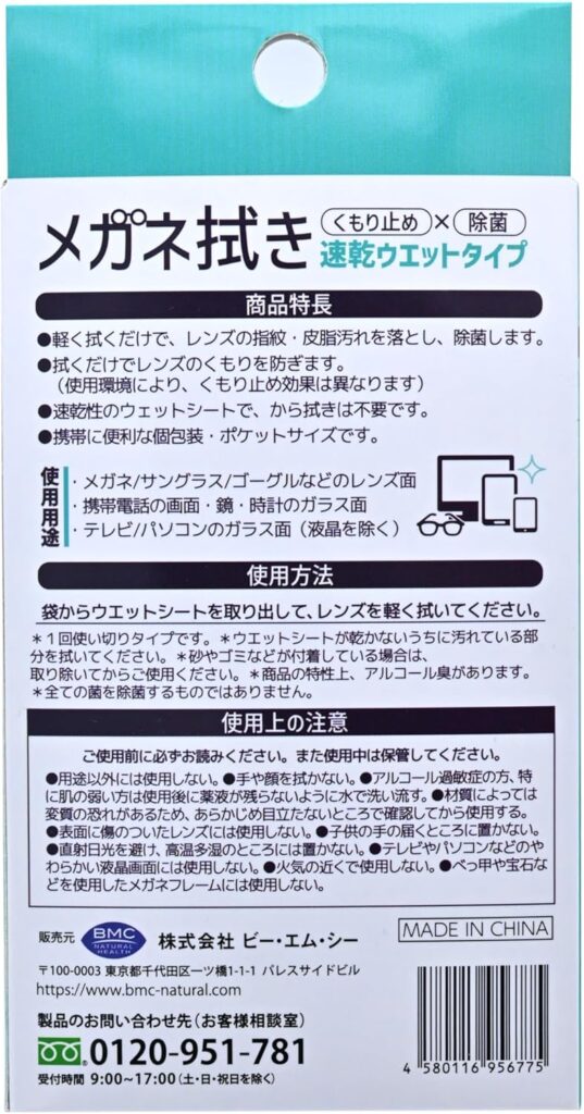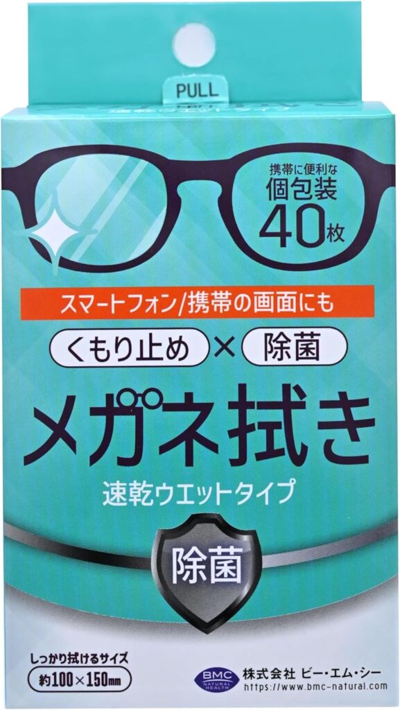 | BMC メガネ拭き | ★4.1(109件) | 約10cm×15cm | 個包装40枚入りウェットタイプ/速乾性あり/から拭き不要 | 345円 | 無料 |