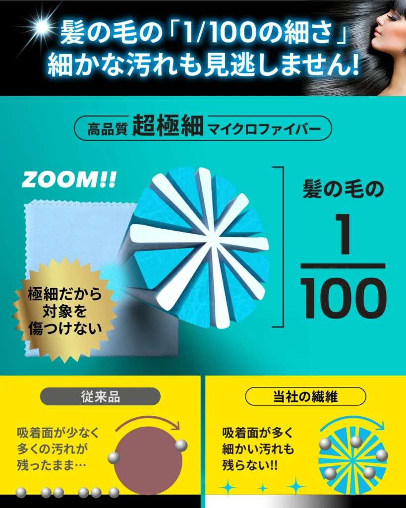 - 髪の毛の100分の1の極細繊維マイクロファイバーで傷がつきづらい