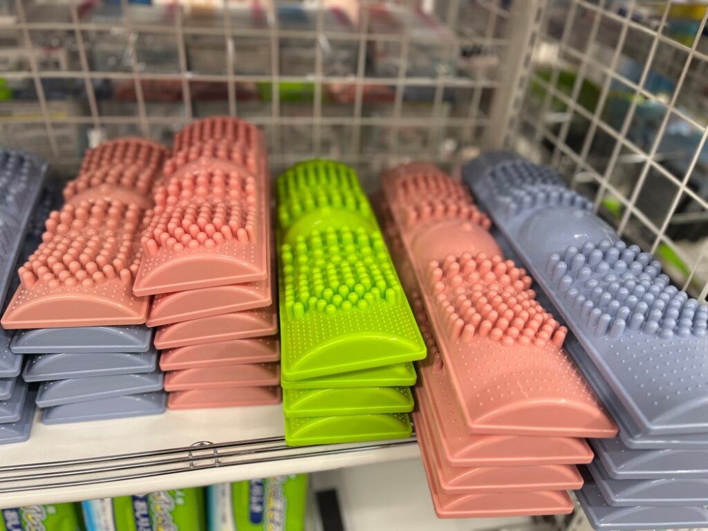 | ダイソー | 高さの違う突起で刺激強め。長めタイプ(45×10.5×4.5cm)あり。色・形違いも数種あり | 110円(税込) | 店舗により異なる | 刺激が強いためタオルを挟んで使用する人も |