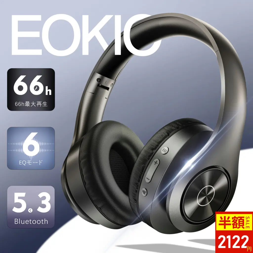 | EOKIO ヘッドホン | ☆4.54(50件) | 約280g | ・Bluetooth対応 ・2.5時間充電で最大35時間連続使用 ・高解像度サウンド ・高遮音&音漏れ防止 ・安定した接続性 | 2,480円 | 無料 |