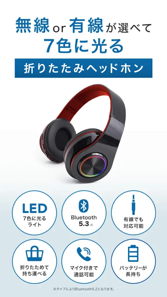 | MONO KOTO DEPT.店 ヘッドホン | ☆4.00(364件) | 約250g | ・Bluetooth対応 ・連続使用:8~12時間 ・7色LEDライト搭載 ・マイク内蔵 ・折り畳み式 | 1,980〜2,380円 | 無料 |