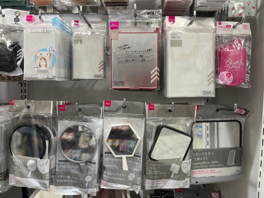 筆者が確認したところ、110円から990円まで、色違いや形が少し違うものなど数種類の鏡がありました。
