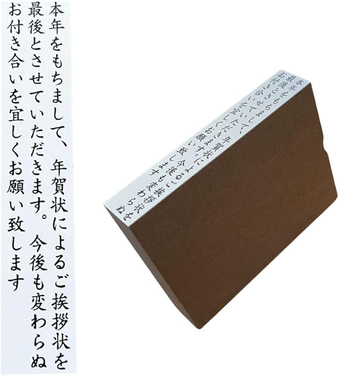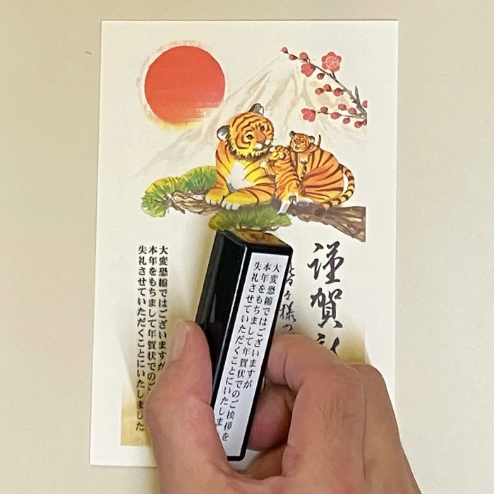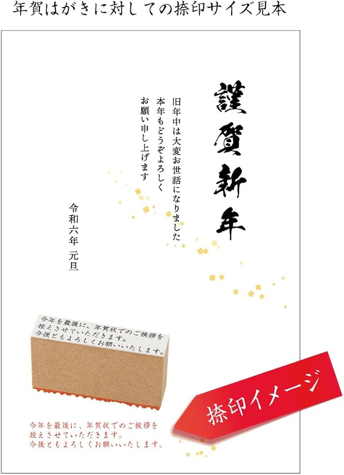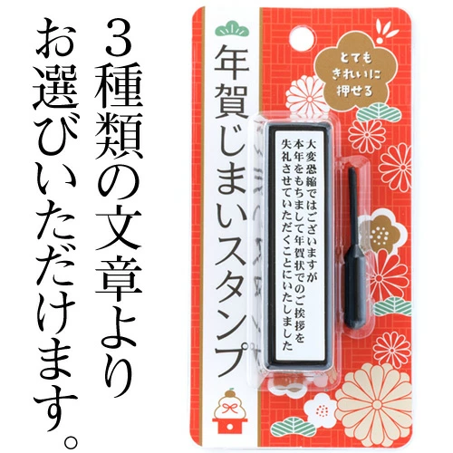 年賀状じまい ゴム印 | 3.6(19件) | 印面:1.2×7.4cm/本体:7.4×1.5×6.2cm | 使いやすい縦型レイアウト、横書きタイプもあり | 750円 | 無料 |