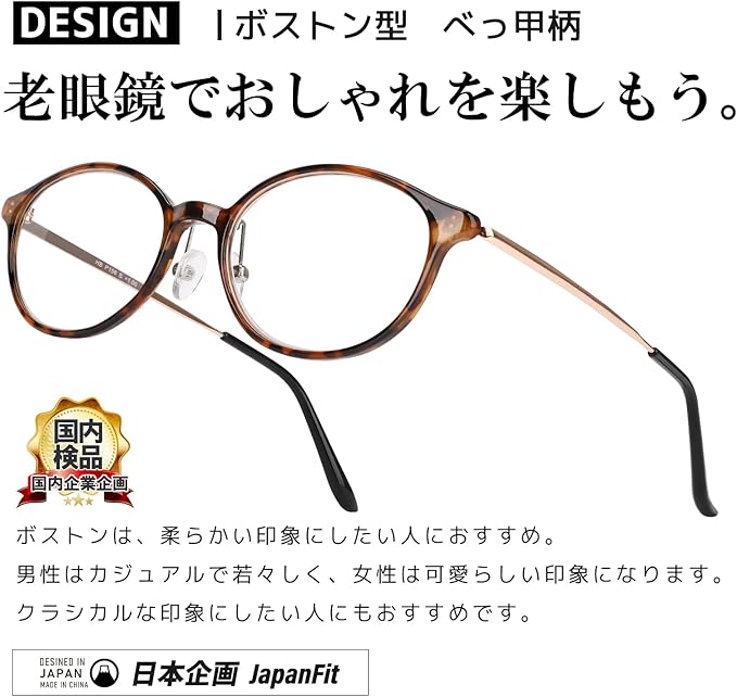 • 老眼鏡に見えないおしゃれなボストン型デザイン、老眼鏡のイメージを覆す、アクセサリー感覚で選ぶちょっとオシャレな大人のための老眼鏡です。