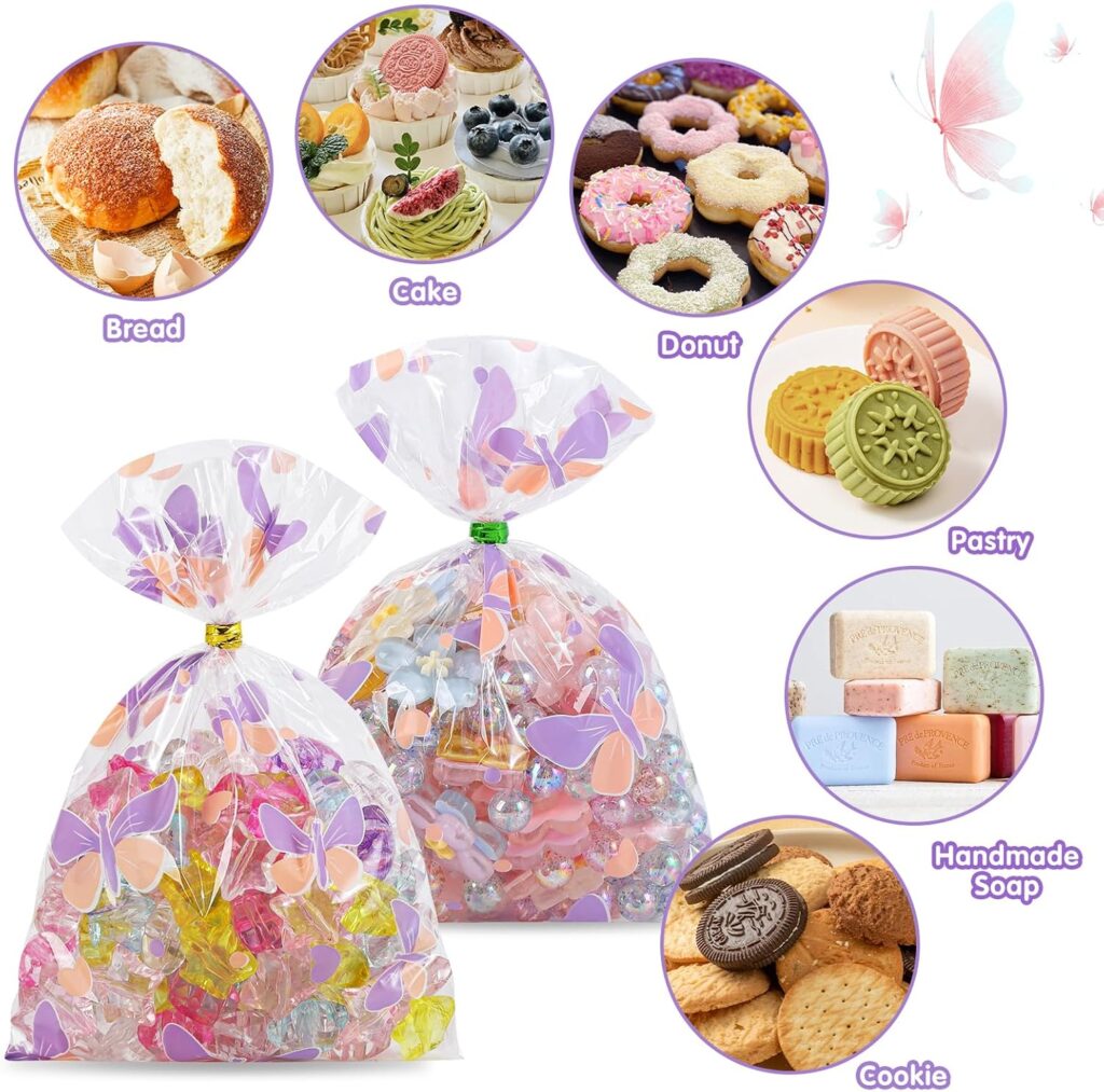 - バタフライ柄のセロハンバッグ100枚と、ゴールドのツイストタイ100個付き。